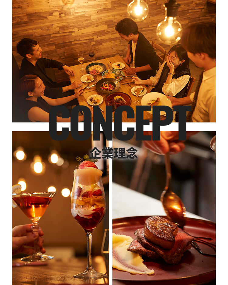 いつ来店しても、空間とお料理の質は変わらずに、老若男女問わずお食事の時間を心から楽しめること。また、1人でも、家族とでも、友人とでも、職場の仲間とでも、幅広いシーンで思い思いの時間を過ごせること。それは、スタッフ全員が常に意識を持ち、どの場面においても守り続ける弊社の考え方の軸となっています。